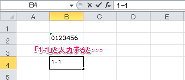 頭に'[アポストロフィ]をつけ、「’1-1」と入力すると「1-1」と表示されるようになります。
