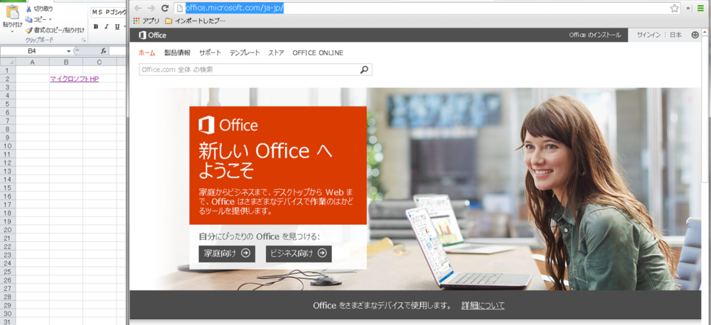 このセルをクリックすると、下図のように設定したWebページが表示されます。(今回はマイクロソフト社のOfficeのページを参照)