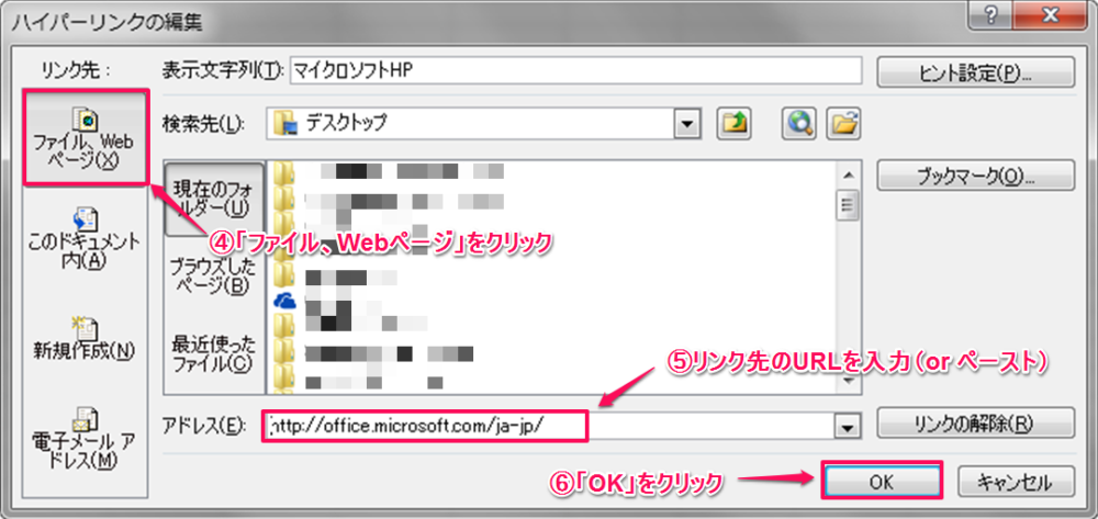 「ハイパーリンクの編集」ダイアログをすでに開いている状態から解説します。
