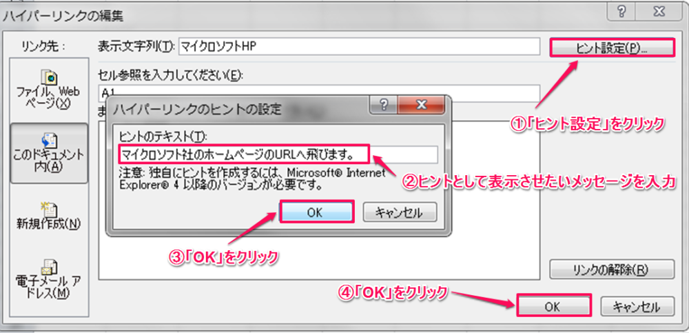 - 「ハイパーリンクのヒントの設定」ダイアログ内にメッセージとして表示したい文字列を入力