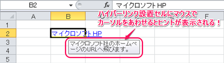 ハイパーリンクが設定されたセルでマウスのカーソルをあわせると、先ほど設定したメッセージが表示されるようになりました!