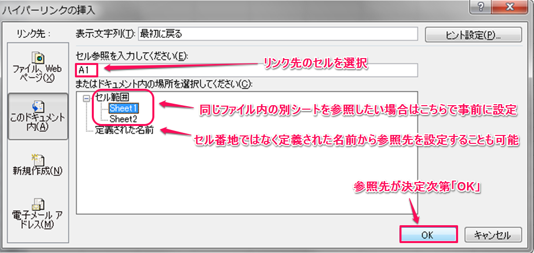 基本的に、ハイパーリンクを設定するセルと同一シートであるとデフォルトでは設定されてしまうため、別シートになる場合やセル番地ではなく定義づけしておいた名前をリンク先にしたい場合は[またはドキュメント内の場所を選択してください]の下から設定しましょう。