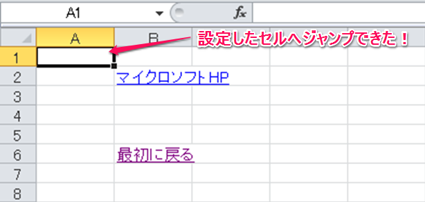 ハイパーリンクを設定したセルをクリックすると、先ほど設定したA1セルへジャンプしました。