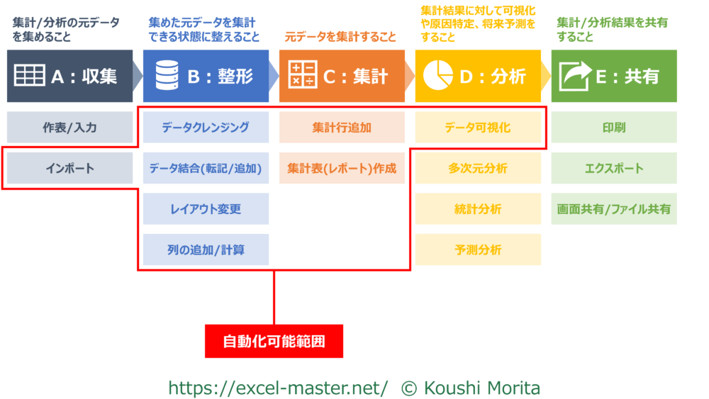 具体的には、Excelの一連の作業プロセスのうち、最低限以下の範囲を自動化しましょう。