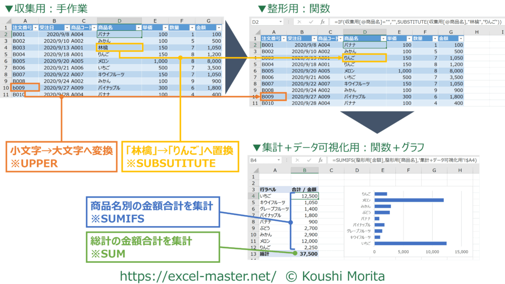 最終的なアウトプットとなる集計表の作成までの処理を自動化するために、整形と集計は関数、データ可視化はグラフや条件付き書式をセットしておきましょう。