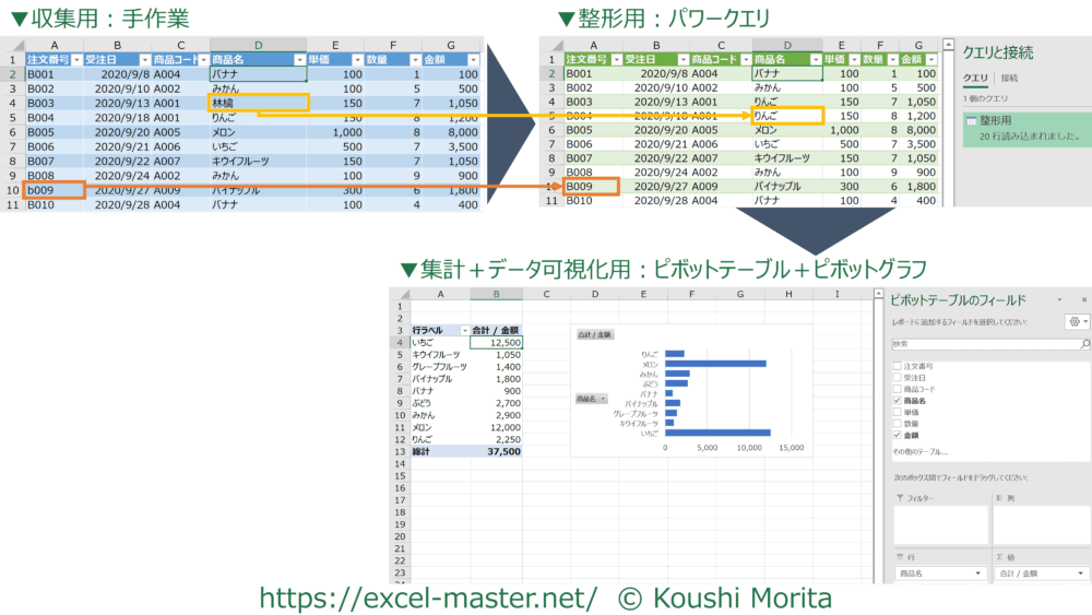 このパターンだと、収集/整形はパワークエリ、集計はピボットテーブル、データ可視化はピボットグラフや条件付き書式をセットすることになります。