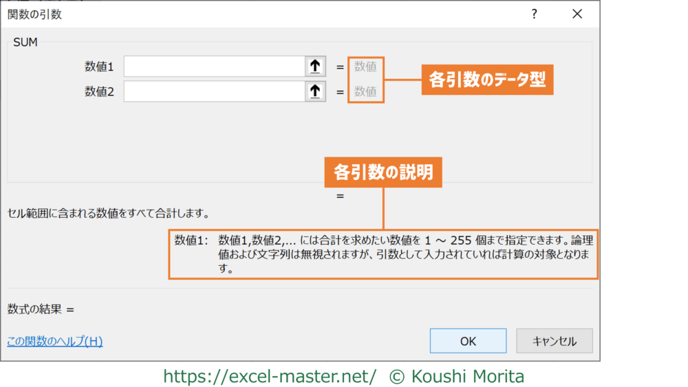 「関数の引数」ダイアログは各引数のデータ型や説明が記載されるため、どんなデータを設定うれば良いかが分かりやすいです。