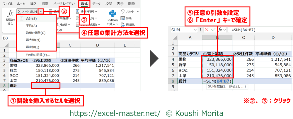 「オートSUM」コマンド経由で入力する手順は、以下の通りです。