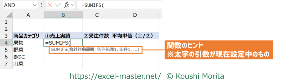 引数の部分も「関数のヒント」が表示され、現在どの引数を設定中か分かります。