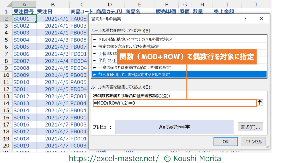 一例として、条件付き書式で偶数行を対象に色付けする場合の数式が以下です。