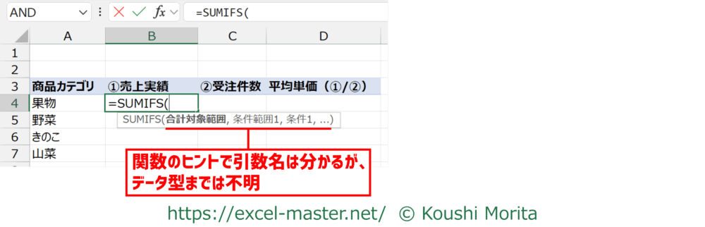 直接入力では、関数のヒントでどの引数を設定中か分かるものの、その引数に設定すべきデータ型までは分かりません。