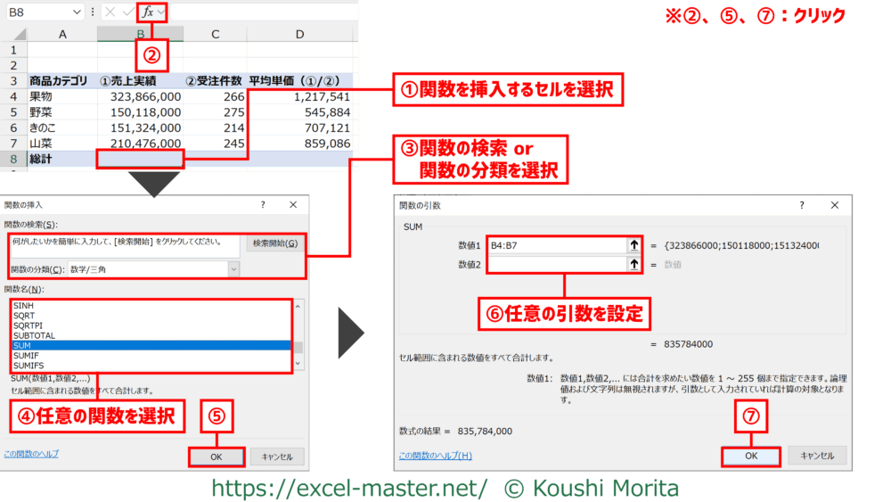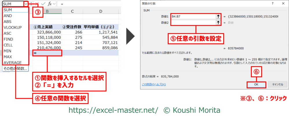 【挿入方法②】「関数の引数」ダイアログ経由で入力