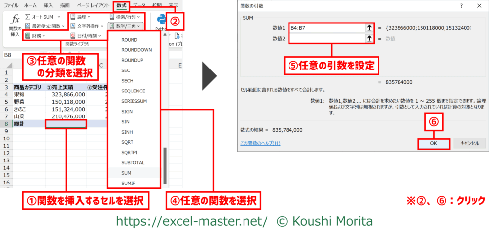 手順④で選択する関数名をダブルクリックで手順⑤を省略可能。