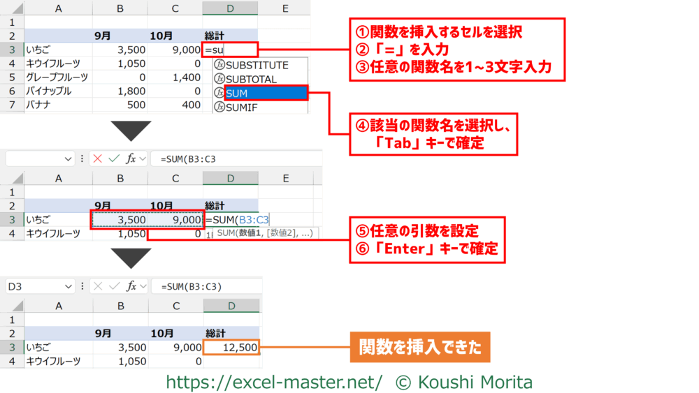 関数を実務へ活用していくために押さえてほしいことは何点かありますが、最初は関数の数式を手早く挿入することです。