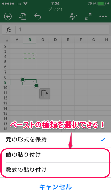 ここをタップすると、ペーストの種類を選択できます。