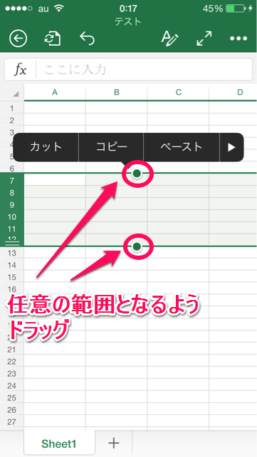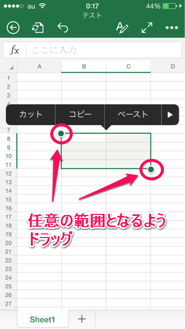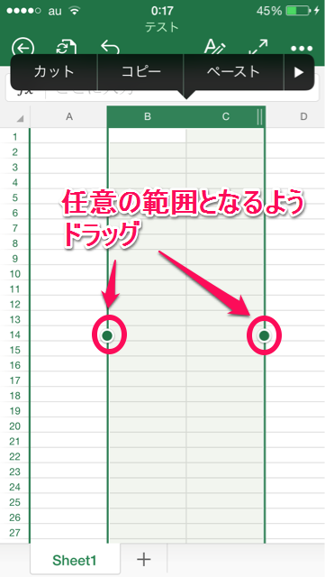 - 起点となるセルをロングタップしながら任意の部分までドラッグ