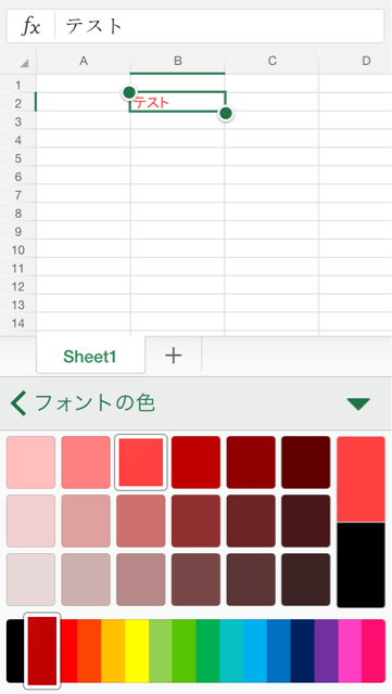 セルの塗りつぶしの色と同様にPC版と比較すると、ユーザー設定の色は細かい色を設定できますが、明暗までは設定できません。