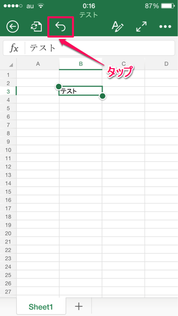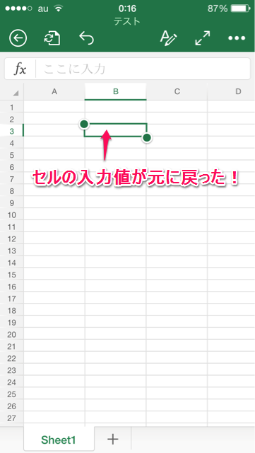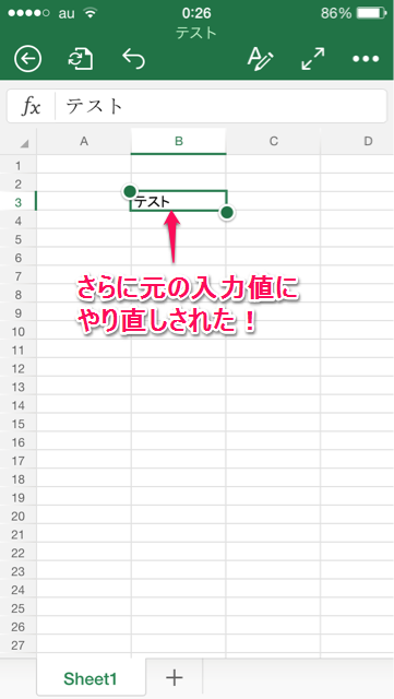 「元に戻す」前の状態としてB3セルに”テスト”という入力値に戻りました。
