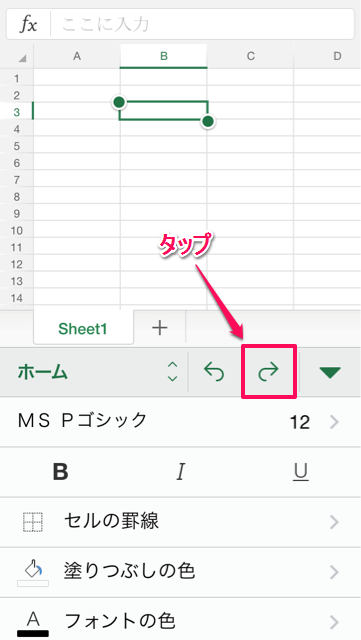 PC版も同様ですが、ワークシート上にガシガシと入力を行う場合は、この「元に戻す」と「やり直し」は処理効率アップには必須の機能です。