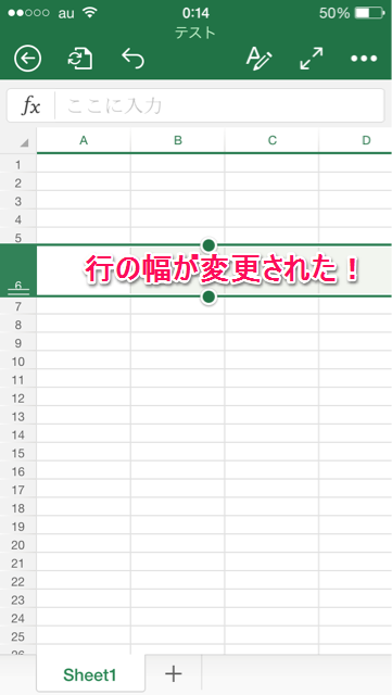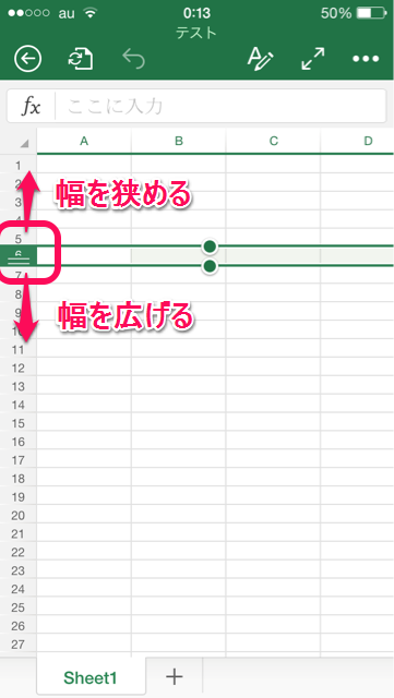 行の緑部分をロングタップしてドラッグすると行の幅を調整することができます。