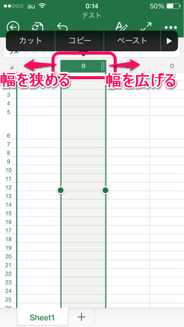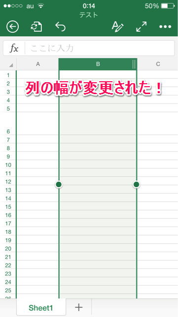 列の緑部分をロングタップしてドラッグすると列の幅を調整することができます。