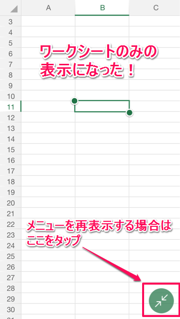 なお、メニューを再表示させたい場合は、ワークシートの右下にある2つの逆方向のななめ矢印マーク(↙↗)をタップしましょう。