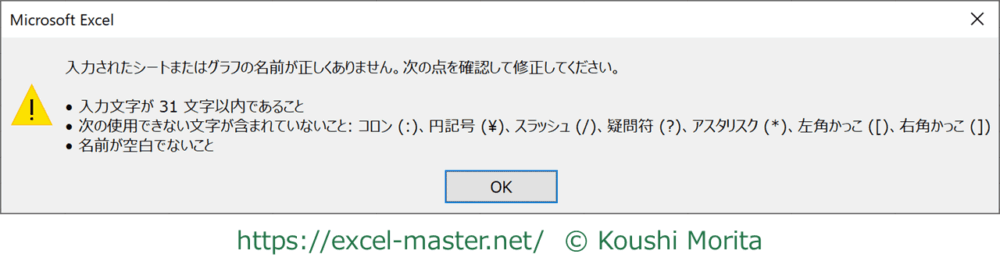 - 次の使用できない文字が含まれていないこと:コロン(:)、円記号(\)、スラッシュ(/)、疑問符(?)、アスタリスク(*)、左角かっこ([)、右角かっこ(])