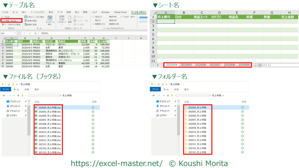 最終的に自動化するには、各種データの名前の付け方に規則性を持たせる必要があります。