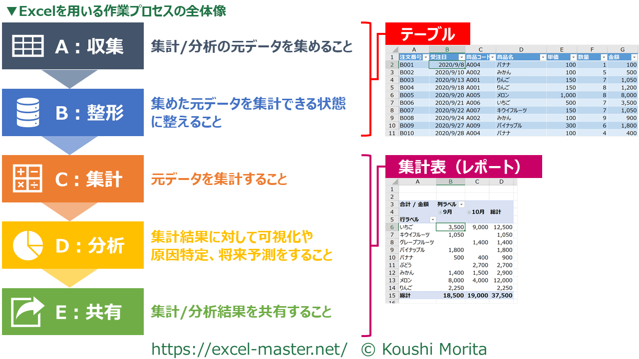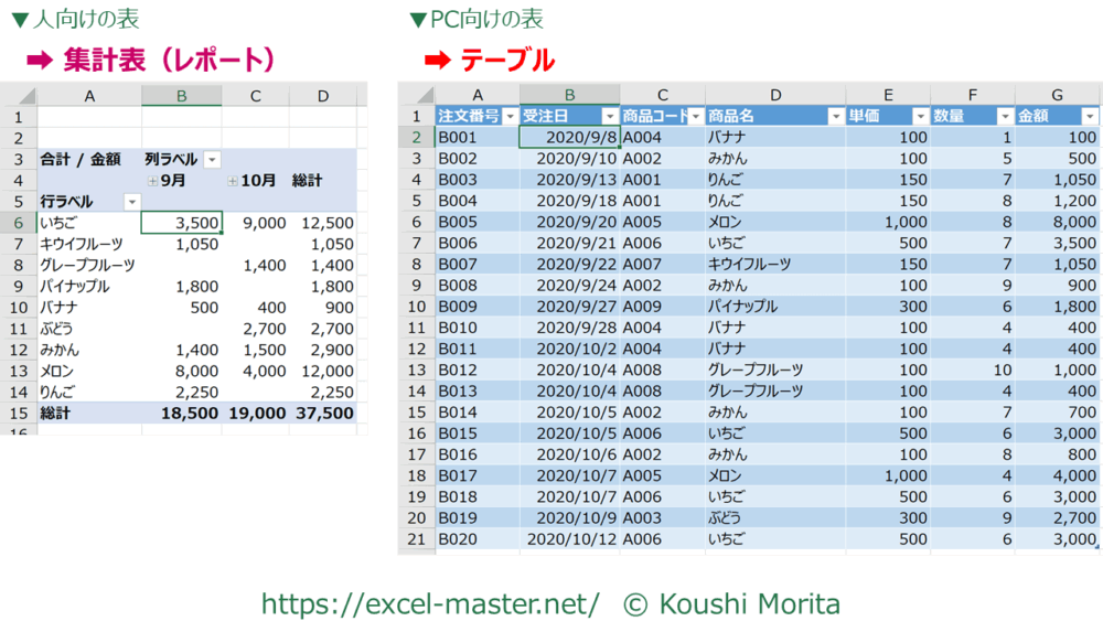 まとめとして、「人向けの表=集計表(レポート)」と「PC向けの表=テーブル」をExcelの作業プロセスで役割を明確に分けることも可能です。