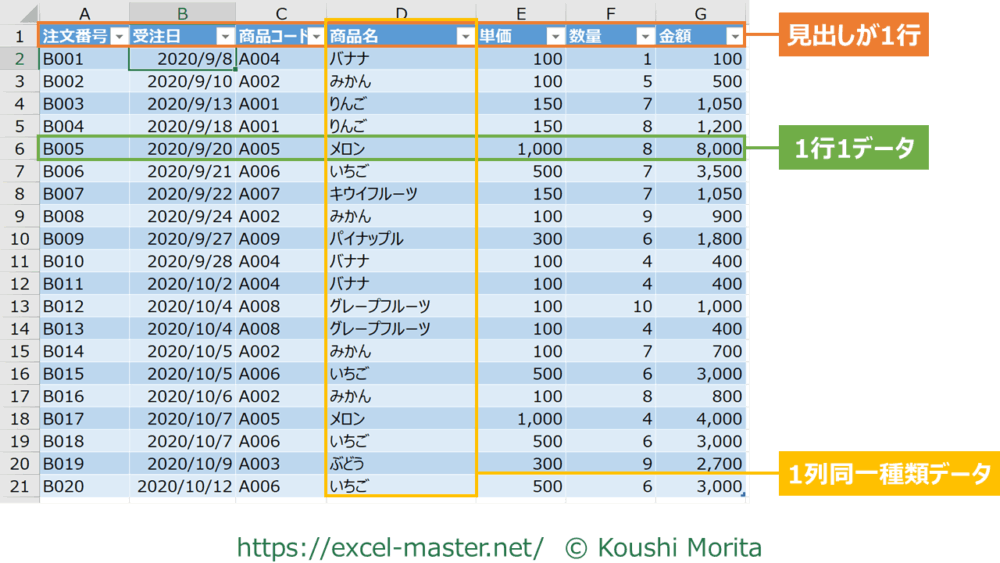 Excelには、この3つの特徴を満たしやすくするための機能として「テーブル」があります。