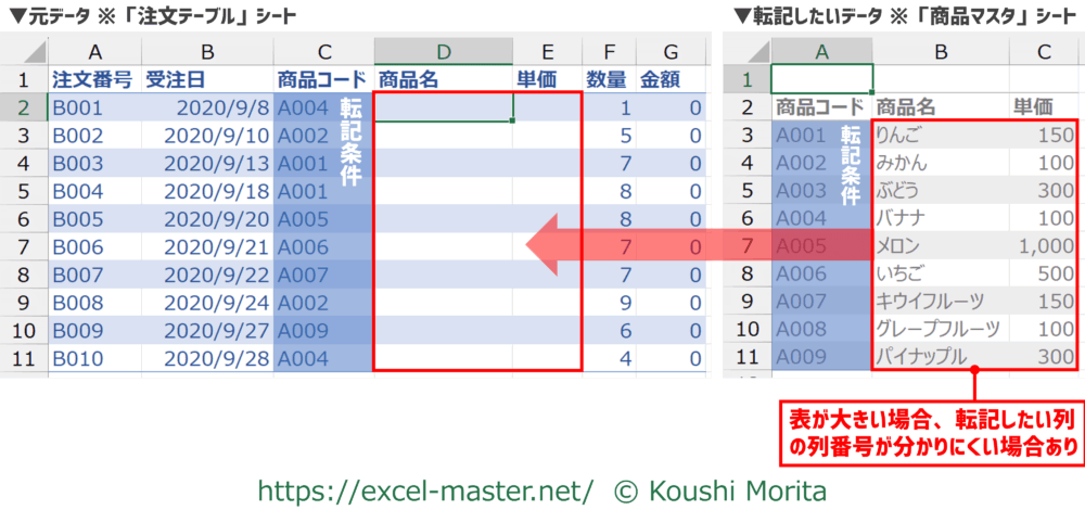 VLOOKUPで大きめの表を検索対象にする場合、転記したい列の列番号がパッと見で分かりにくい場合があります。
