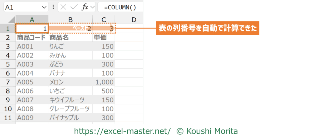 COLUMNを使うことで、指定したセルの列番号を自動で計算できます。