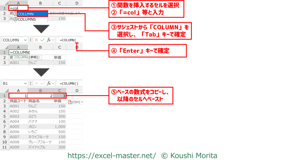 COLUMNを使い、列番号を自動計算するイメージは以下の通りです。