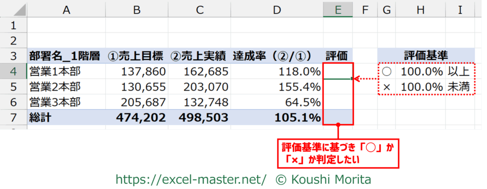 売上をレポートする際、目標達成しているなら「◯」、未達なら「×」に記号を振り分ける作業がありますが、いちいち目検で判断するのが大変です・・・。