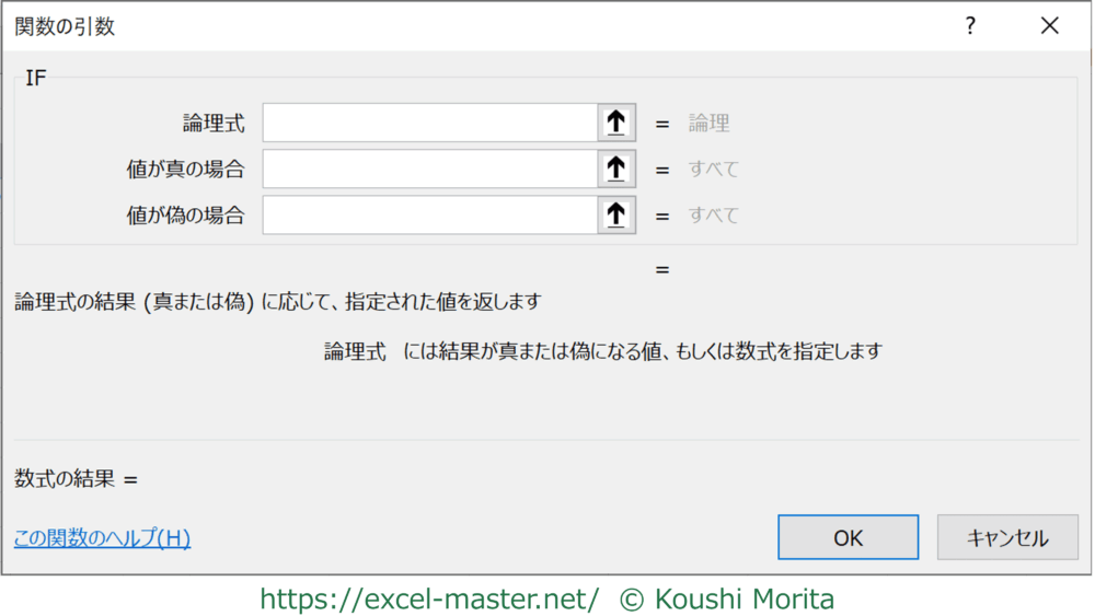 =IF(論理式,[値が真の場合],[値が偽の場合])