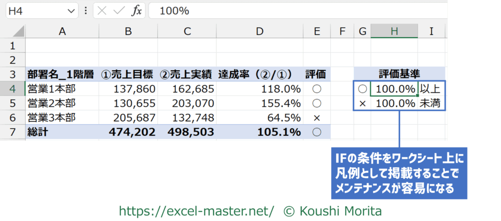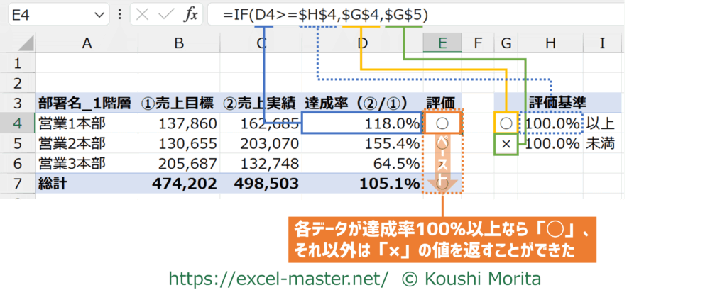 上記の数式「=IF(D4>=$H$4,$G$4,$G$5)」は「=IF(D4>=100%,”◯”,”×”)のように定数で設定しても同じ効果です。