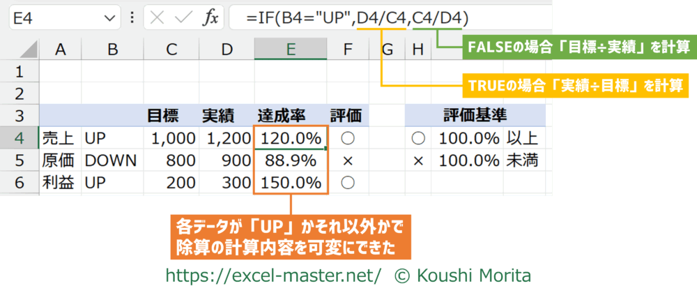 B列が「UP」であれば「実績÷目標」、それ以外は「目標÷実績」と、条件に応じて数式が変わります。