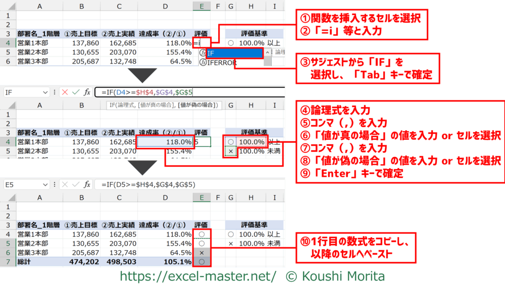たとえば、集計した売上金額が目標達成しているか否かを「◯」や「×」で判定する、あるいはテストの成績に応じて「A」や「B」といったランク付けを行うイメージです。