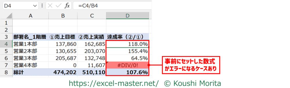 上記の表では、D7セルが「#DIV/0!」というエラー値になっていますが、これは除算(割り算)の分母となるB7セルが「0」であることが原因です。