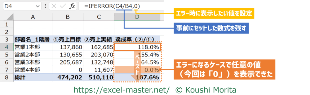 また、今回は引数「エラーの場合の値」は「0」を指定していますが、実務ではハイフン(-)、ブランク(””)を指定するケースもあります。