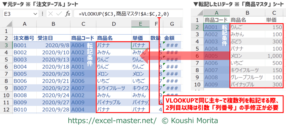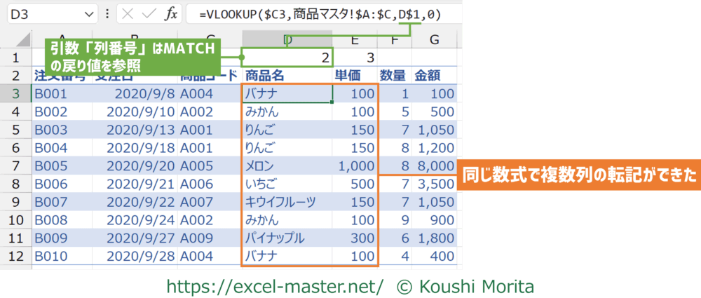後は、MATCHの戻り値をVLOOKUPの引数「列番号」で参照すれば、同じVLOOKUPの数式で複数列の転記が可能となります。