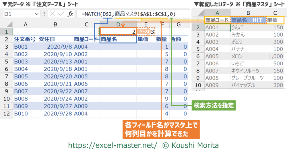 今回は「商品名」・「単価」列が「商品マスタ」シート上で何列目にあるか、計算結果を注文テーブルのD1・E1セルへ表示しました。