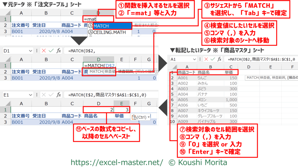 MATCHの各引数はVLOOKUPの引数と類似(以下、左がMATCH、右がVLOOKUP)。