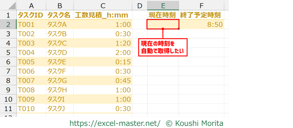 実務では、ワークシート上に現時点の時刻が必要なケースがあります。