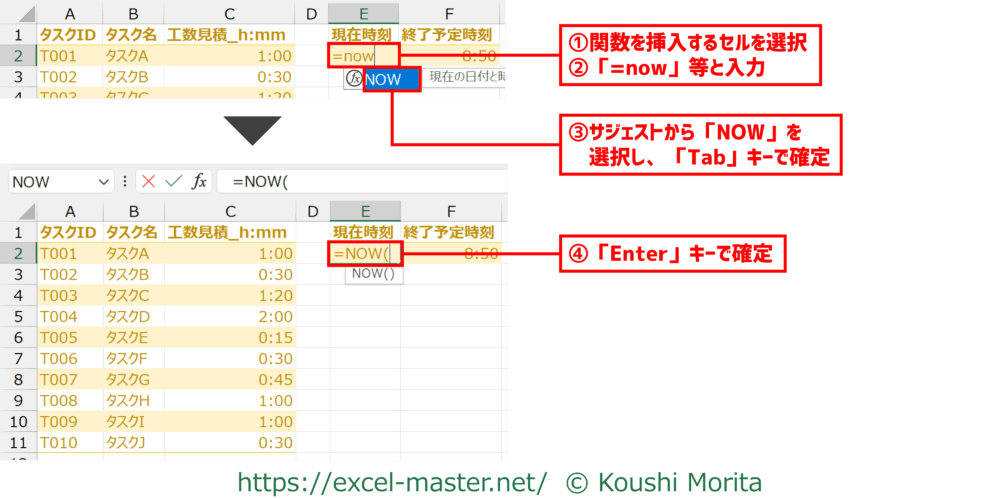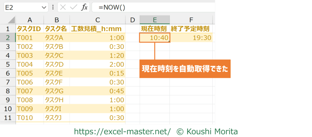現時点の「時刻」を自動で取得したい場合は「NOW」が有効