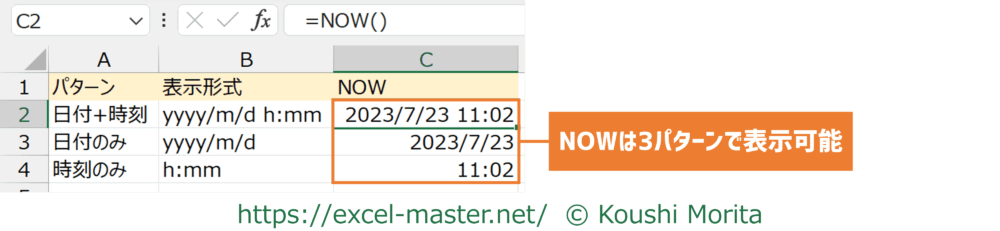 NOWをセットしたセルの表示形式は大別して3パターンあります。