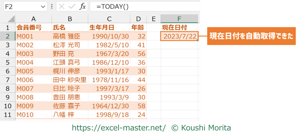 TODAYは現在日付を自動取得したい際に役立つ関数の一つです。