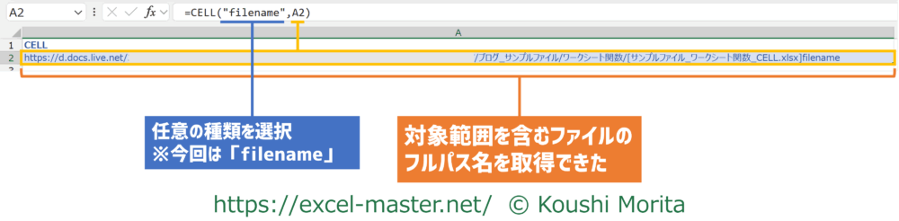 上記では、A2セルが存在するシート名までのフルパス名が表示されました。