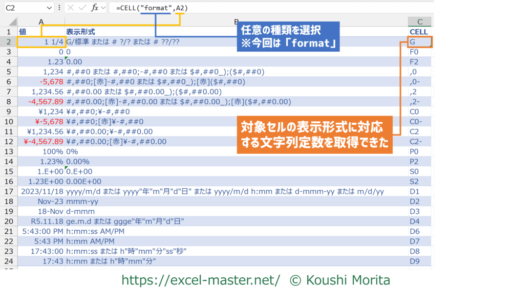 引数「検査の種類」に「format」を指定した場合、対象セルの表示形式に対応する文字列定数が戻り値となります。