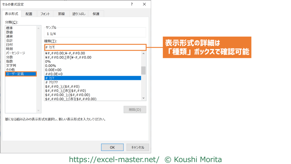ちなみに、具体的な表示形式を確認する場合は、ユーザー定義の「種類」ボックスの内容を確認しましょう。